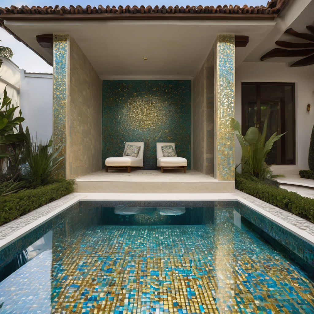 Transform your private outdoor plunge pool with the ‘Abstract Gold Geometry’ glass mosaic design. Crafted with glass mosaic tiles, this design delivers vibrant detailing beneath crystal-clear water. Shimmering reflections and luxury tropical landscaping complete the perfect villa pool ambiance.