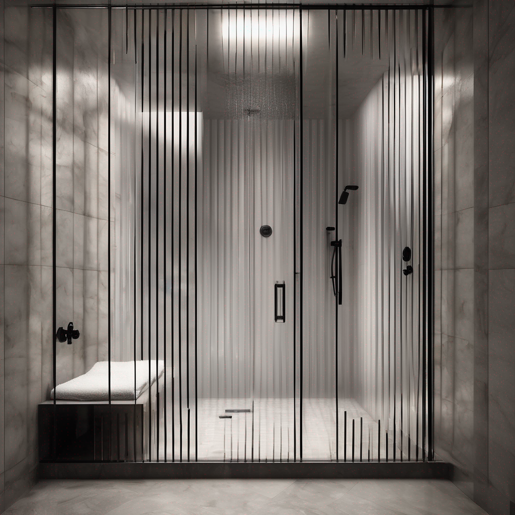 Luxury shower enclosure glass design: Classic Flute (BRT-PAT-8) with Black Hardware. Reeded/fluted texture look. Trending, hides water marks. Custom sizes available. Premium finish for modern bathrooms.