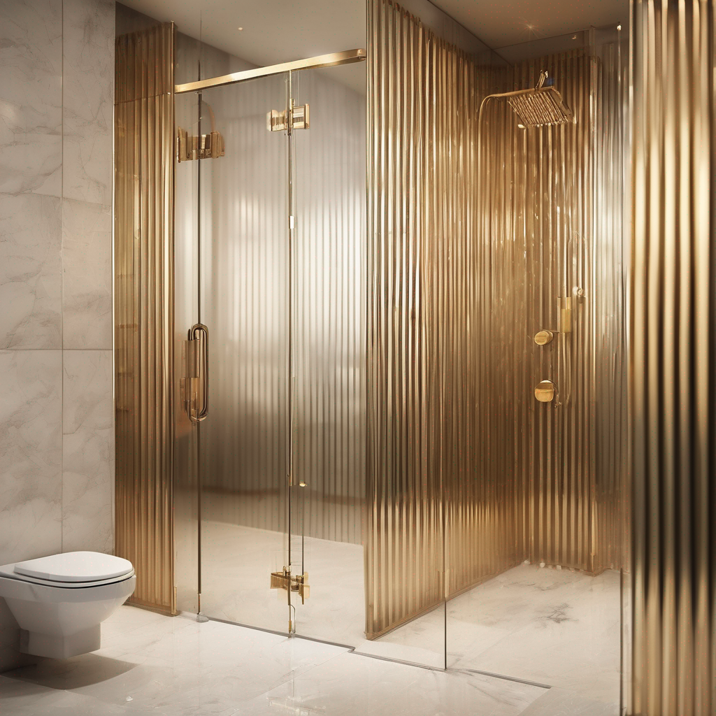 Luxury shower enclosure glass design: Classic Flute (BRT-PAT-8) with Gold Hardware. Reeded/fluted texture look. Trending, hides water marks. Custom sizes available. Premium finish for modern bathrooms.