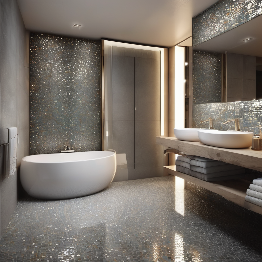 Luxury bathroom design with glass mosaic tiles in a Cool-toned concrete effect mosaic.