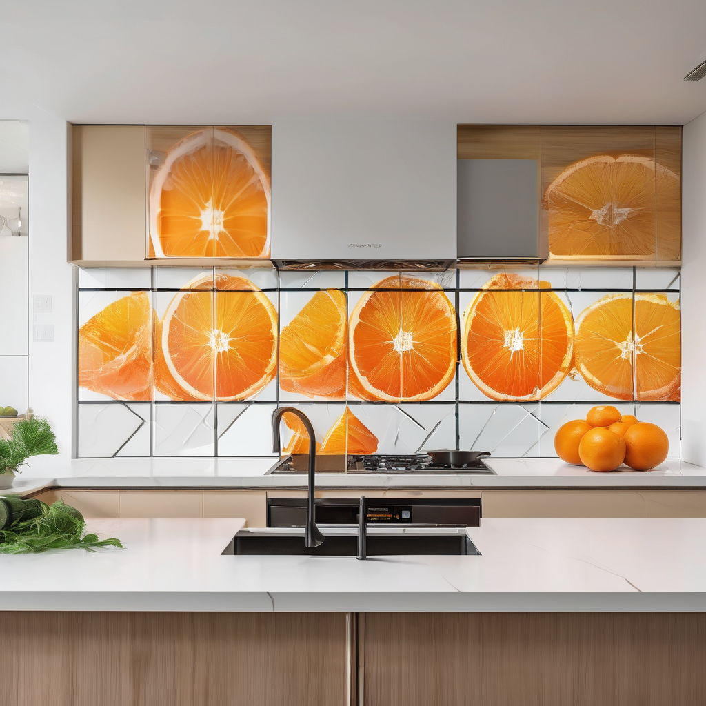 Add modern luxury to your kitchen with the Orange Burst design. Featuring Sliced oranges with splashing juice effect, glossy vertical panels for modern kitchens, this high-gloss glass backsplash brings depth, shine, and elegance to your cooking space.