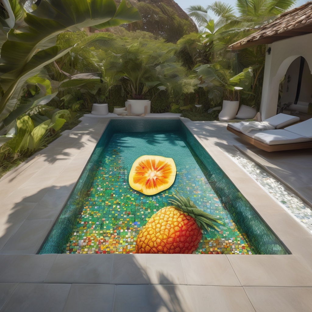 Transform your private outdoor plunge pool with the ‘Tropical Fruit Fantasy’ glass mosaic design. Crafted with glass mosaic tiles, this design delivers vibrant detailing beneath crystal-clear water. Shimmering reflections and luxury tropical landscaping complete the perfect villa pool ambiance.