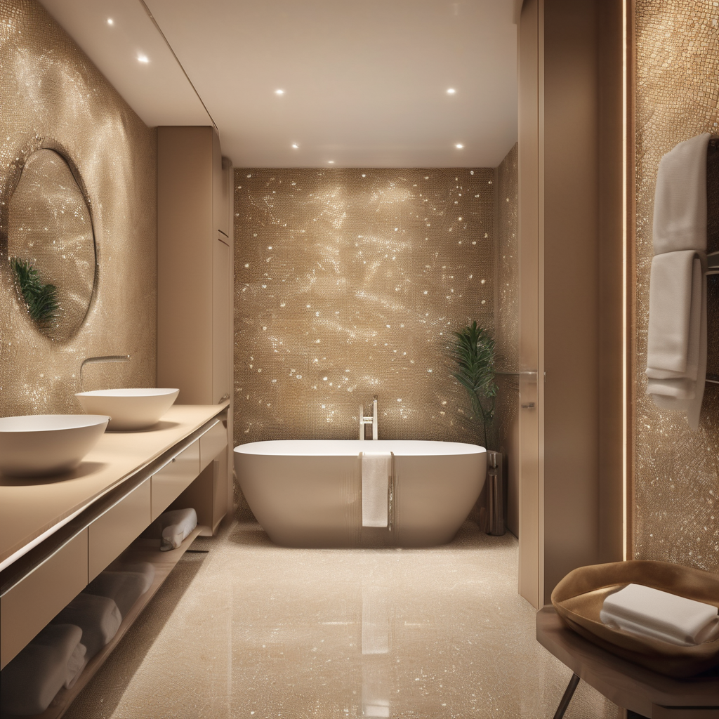 The ‘Warm Sand Dune Texture Mosaic’ bathroom features premium glass mosaic tiling across walls and flooring. This luxury bathroom design combines elegance, detail, and calm ambiance—perfect for appartments and villas homes.
